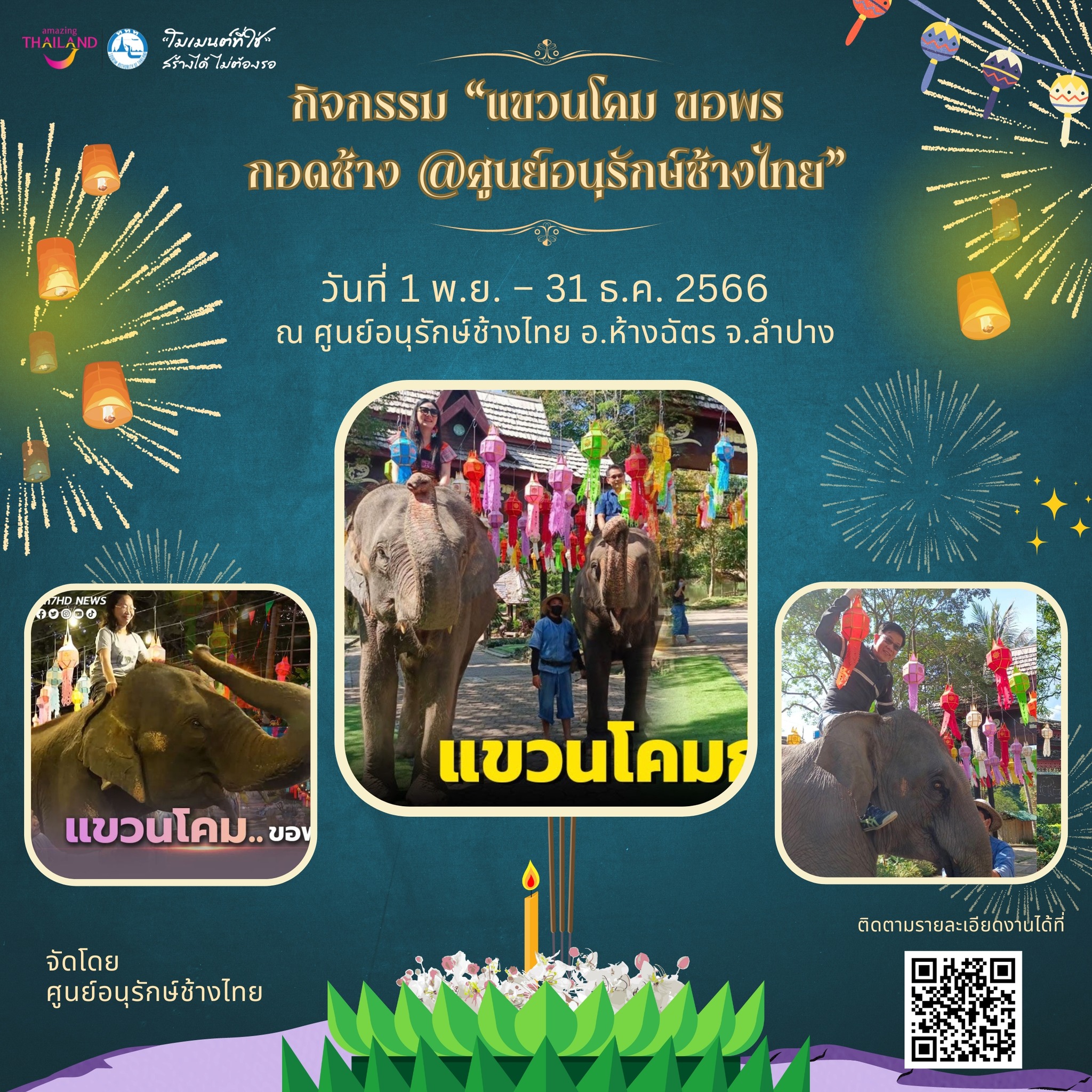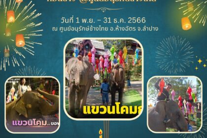 วันที่ 1 พ.ย. – 31 ธ.ค. 2566 ณ ศูนย์อนุรักษ์ช้างไทย อ.ห้างฉัตร จ.ลำปาง จัดโดย ศูนย์อนุรักษ์ช้างไทย จังหวัดลำปาง ศูนย์อนุรักษ์ช้างไทย จ.ลำปาง The Thai Elephant Conservation Center Lampang