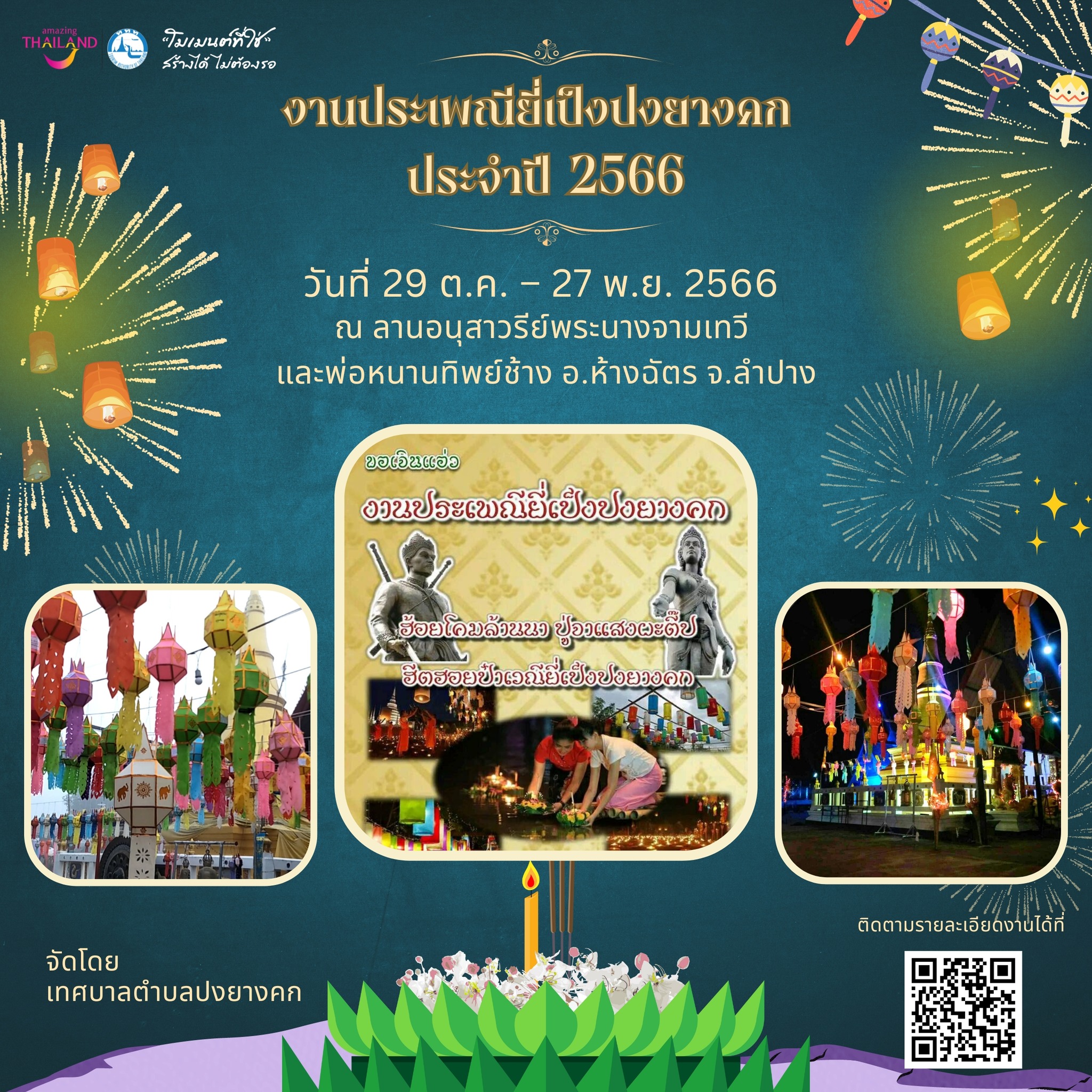 วันที่ 29 ต.ค. – 27 พ.ย. 2566 ณ ลานอนุสาวรีย์พระนางจามเทวี และพ่อหนานทิพย์ช้าง อ.ห้างฉัตร จ.ลำปาง จัดโดย เทศบาลตำบลปงยางคก เทศบาลตำบลปงยางคก