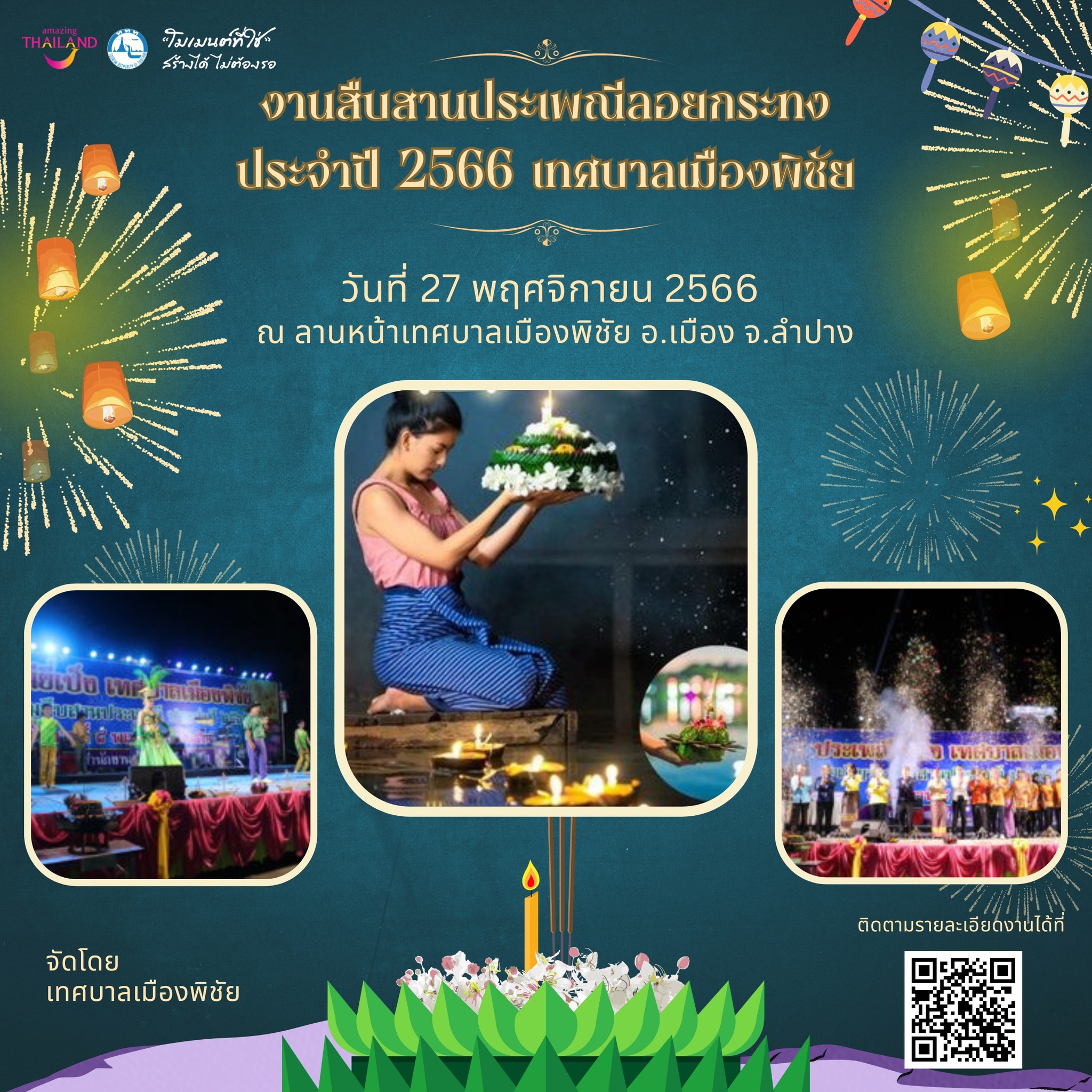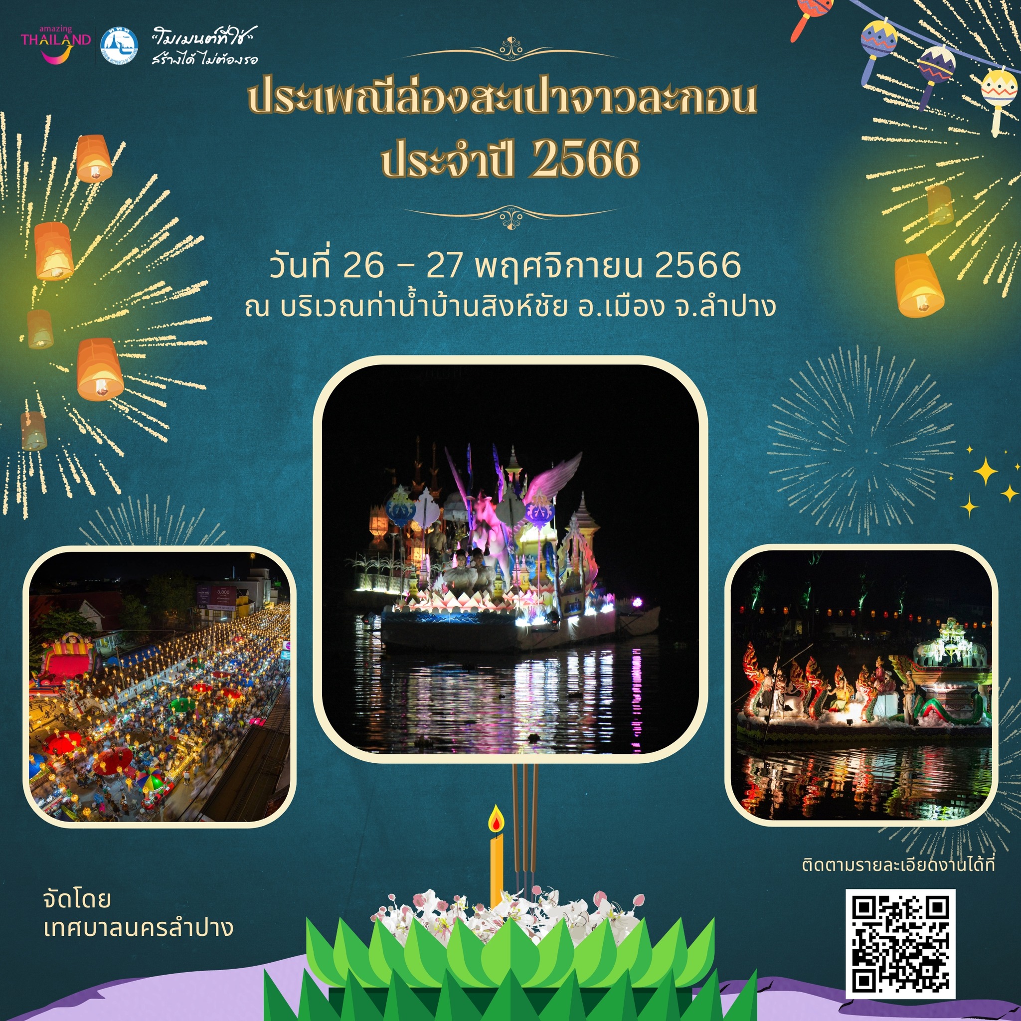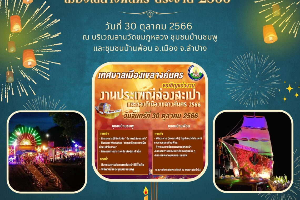 วันที่ 26 – 27 พฤศจิกายน 2566 ณ บริเวณท่าน้ำบ้านสิงห์ชัย อ.เมือง จ.ลำปาง จัดโดย เทศบาลนครลำปาง เทศบาลนครลำปาง เว็บเพจ
