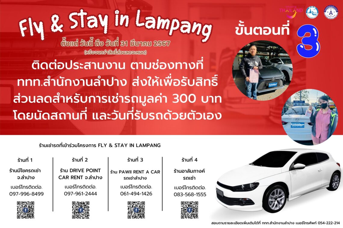 ติดต่อประสานงาน ตามช่องทางที่ ททท.สำนักงานลำปาง ส่งให้เพื่อรับสิทธิ์ส่วนลดสำหรับการเช่ารถมูลค่า 300 บาท โดยนัดสถานที่ และวันที่รับรถด้วยตัวเอง