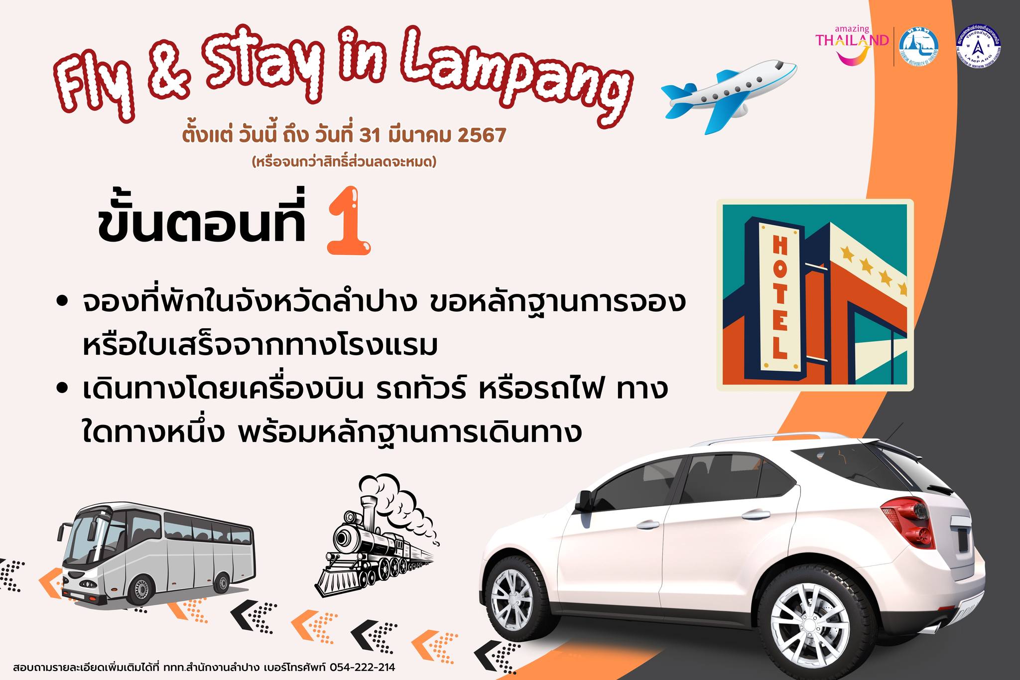จองที่พักในจังหวัดลำปาง แล้วขอหลักฐานการจอง หรือใบเสร็จจากทางโรงแรม พร้อมเดินทางโดยเครื่องบิน รถทัวร์ หรือรถไฟ ทางใดทางหนึ่ง พร้อมหลักฐานการเดินทาง
