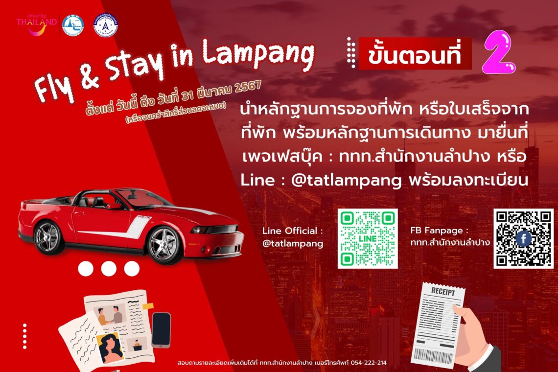 นำหลักฐานการจองที่พัก หรือใบเสร็จจากที่พัก พร้อมหลักฐานการเดินทาง มายื่นยันที่ เพจเฟสบุ๊ค : ททท.สำนักงานลำปาง หรือ Line : @tatlampang