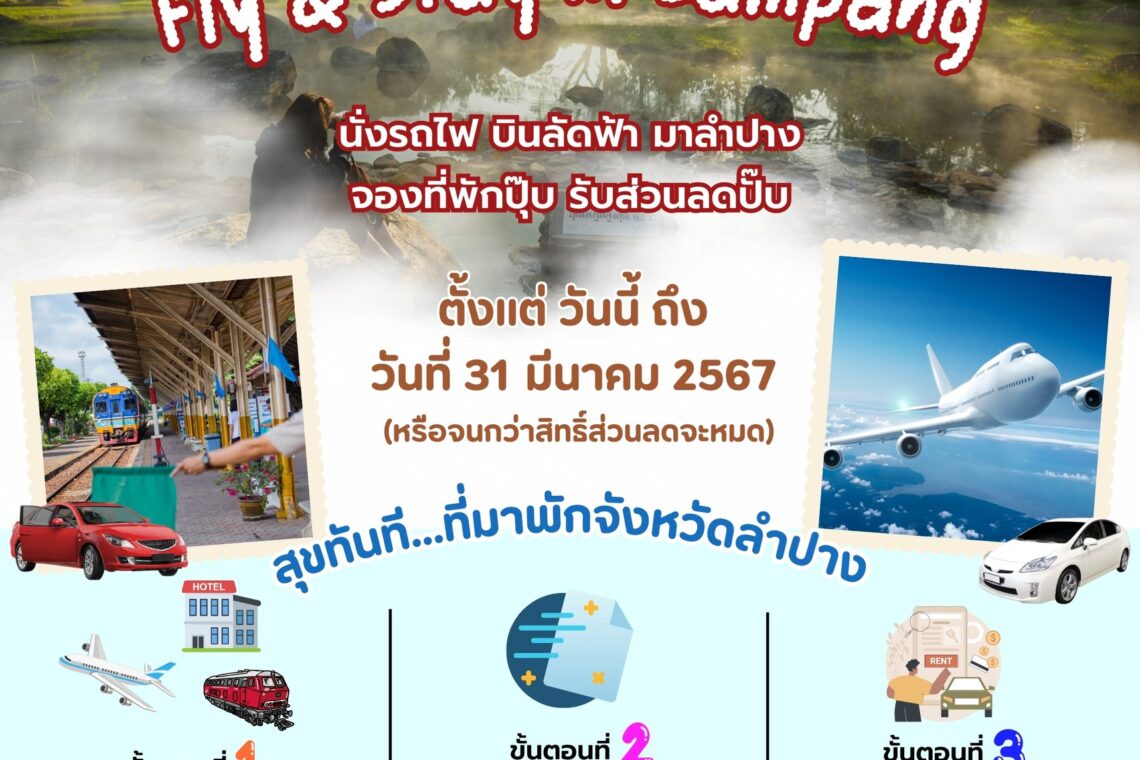 เป็นกิจกรรมที่เชิญชวนนักท่องเที่ยวทุกท่าน เดินทางมาท่องเที่ยวจังหวัดลำปาง โดยรถไฟ รถทัวร์ และเครื่องบิน พร้อมพักผ่อนกาย เพิ่มความสุขที่จังหวัดลำปาง เพื่อรับสิทธิ์ส่วนลด สำหรับการเช่ารถ จาก ผู้ประกอบการรถเช่าในจังหวัดลำปาง ผ่านสมาคมสหพันธ์ท่องเที่ยวภาคเหนือ จ.ลำปาง รับส่วนลดทันทีมูลค่า 300 บาทต่อสิทธิ์ สำหรับการเช่ารถเพื่อการท่องเที่ยวในจังหวัดลำปาง และจังหวัดใกล้เคียง โดยติดต่อการเช่ารถผ่านทาง สมาคมสหพันธ์ท่องเที่ยวภาคเหนือ จ.ลำปาง