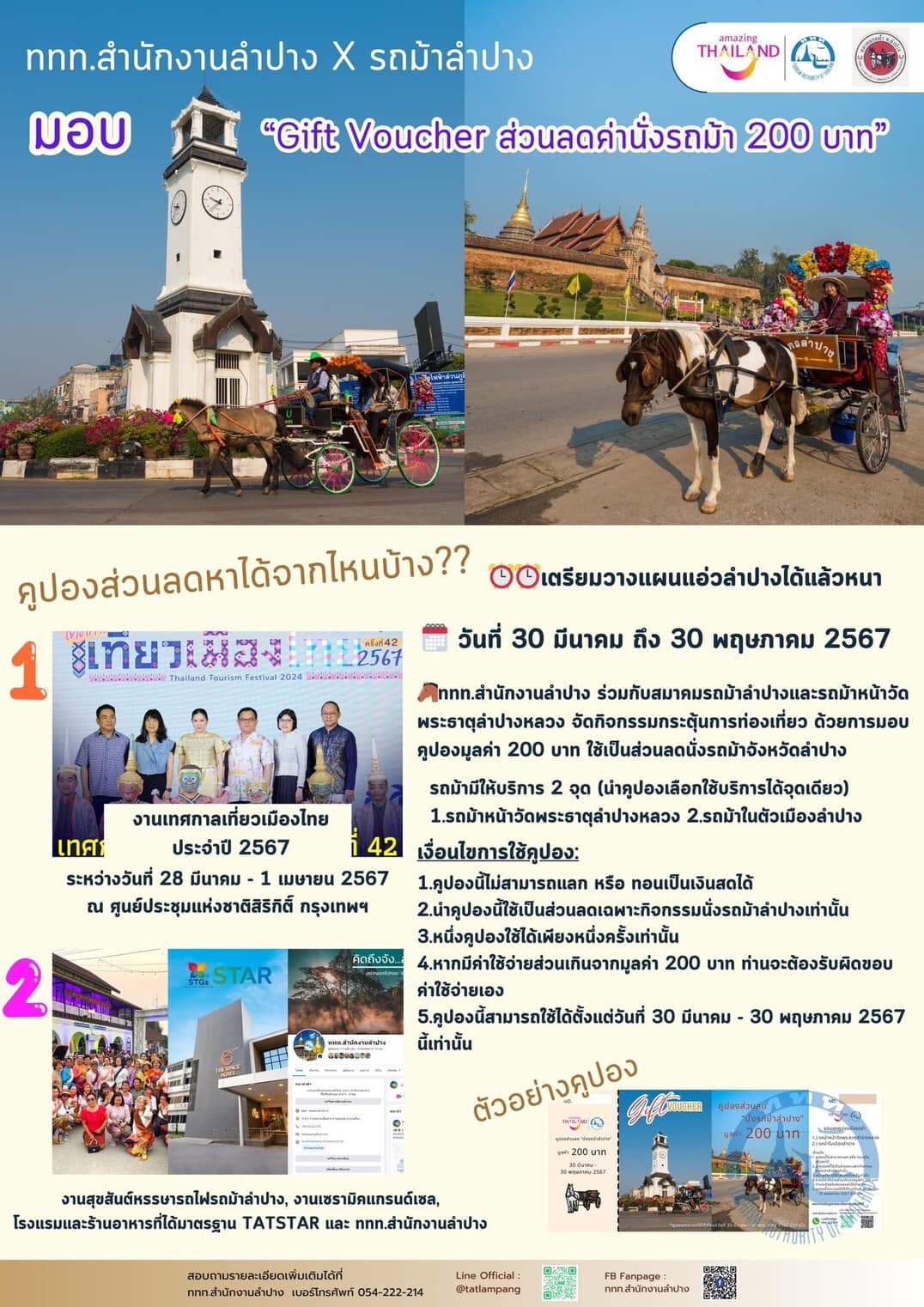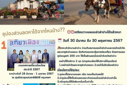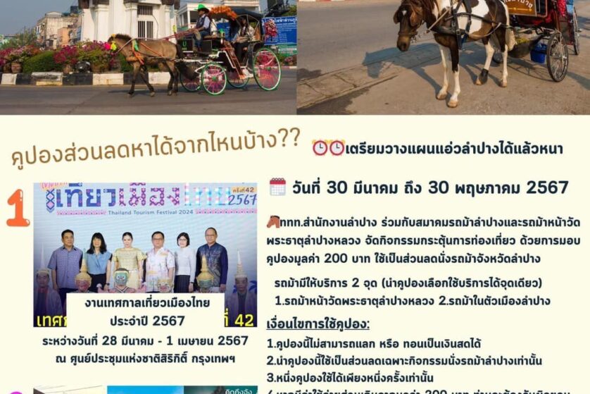 คูปองส่วนลดนั่งรถม้ามูลค่า 200บาท ติดต่อขอรับคูปองได้จากเจ้าหน้าที่สมาคมเครื่องปั้นดินเผาลำปาง